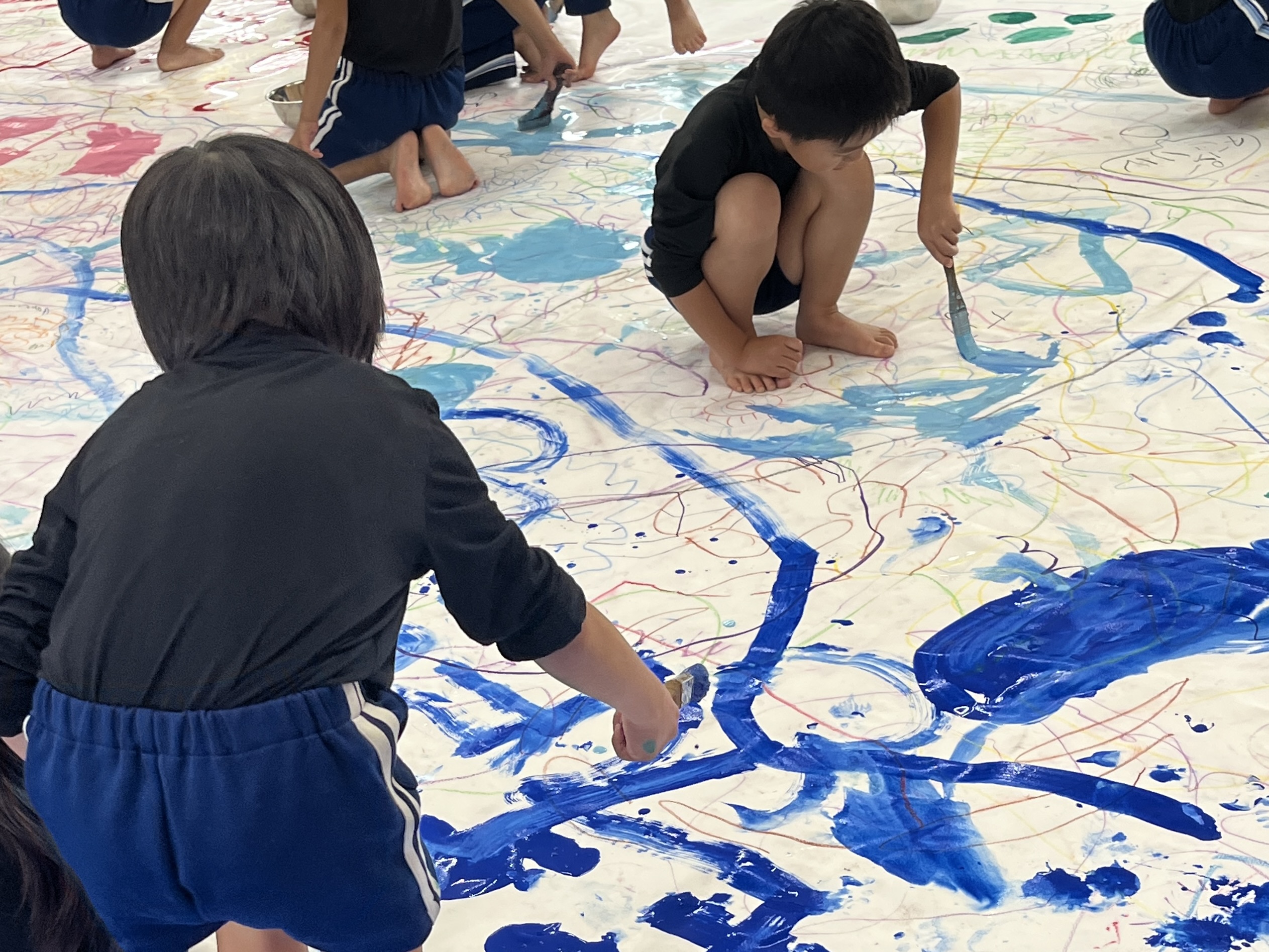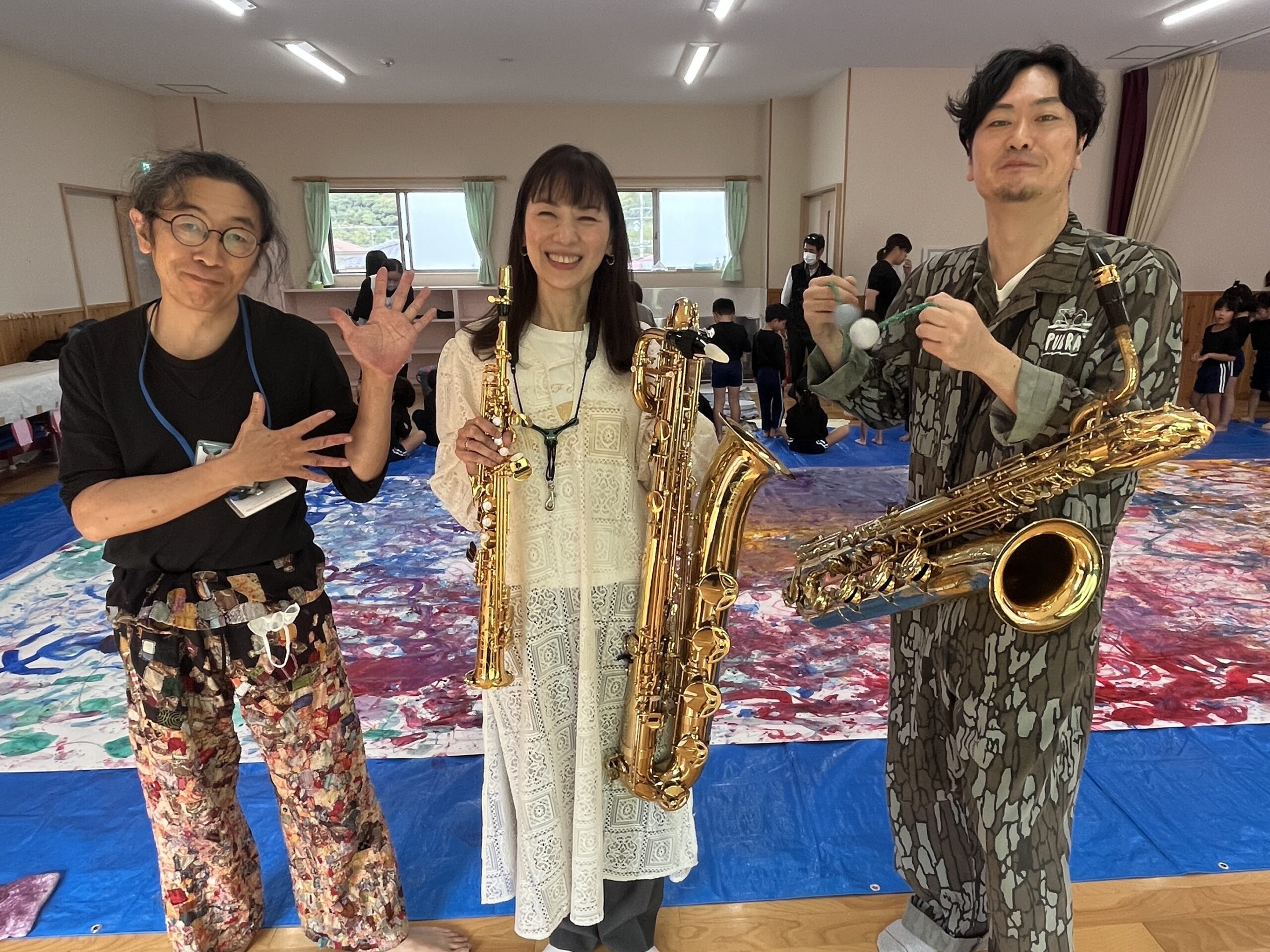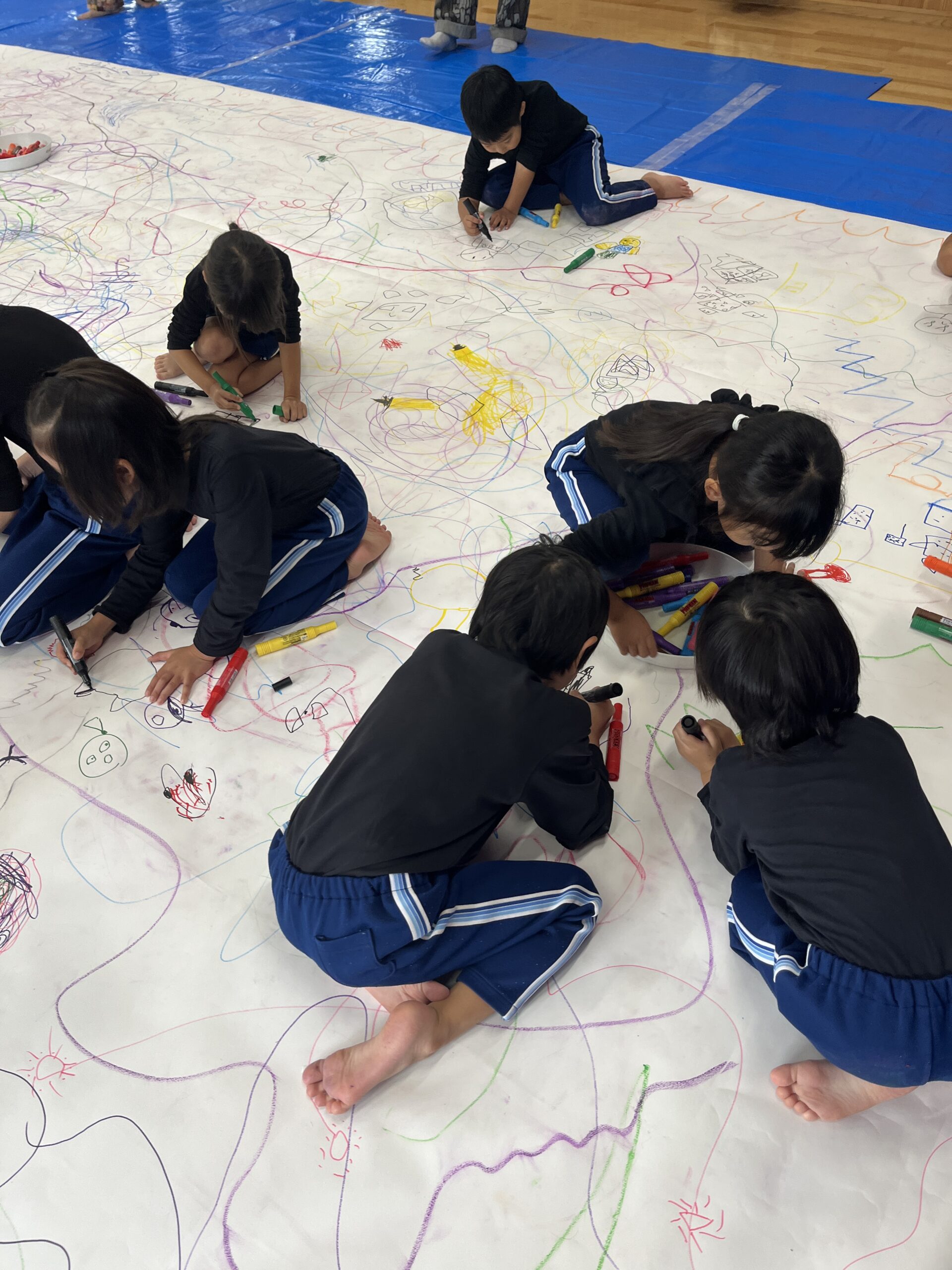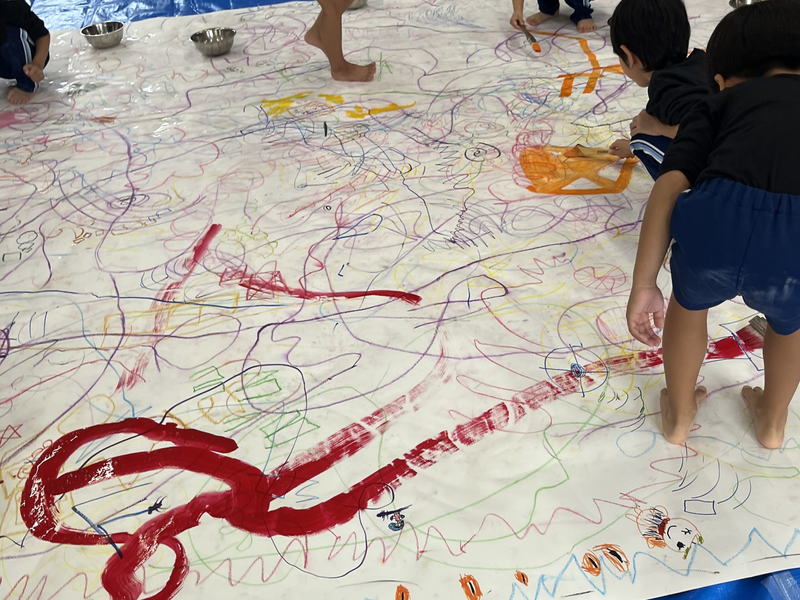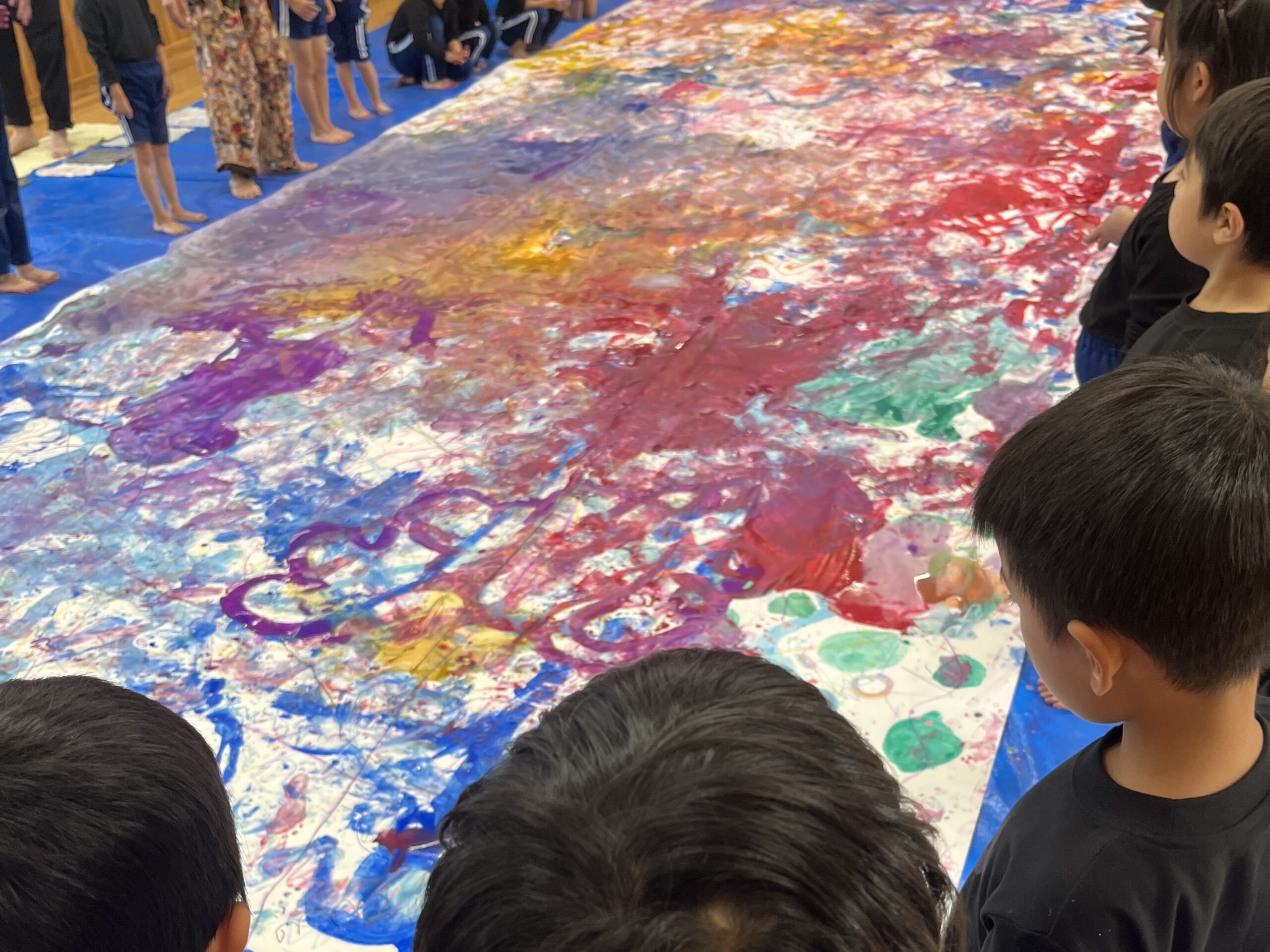 🎨スクールinミュージアム🎨 / ブログ / By miyakawauchi 11月17日(月) スクールinミュージアムで 大分県立美術館(OPAM)の方々に 来園していただきました🎨 くじらホールに広げた 10メートルのキャンバスに😳 楽器の演奏を聴きながら🎶🎷 みんなでクレパスやマーカー、絵の具を使って ひとつの作品を作りました🖼️ 作品が展示される 1月を楽しみにしています🎨 OPAMの えのさん ふっちーさん かなみんさん ともちゃんさん ミュージシャンの りょうこさん、ひろしさん 楽しい体験をありがとうございました😁